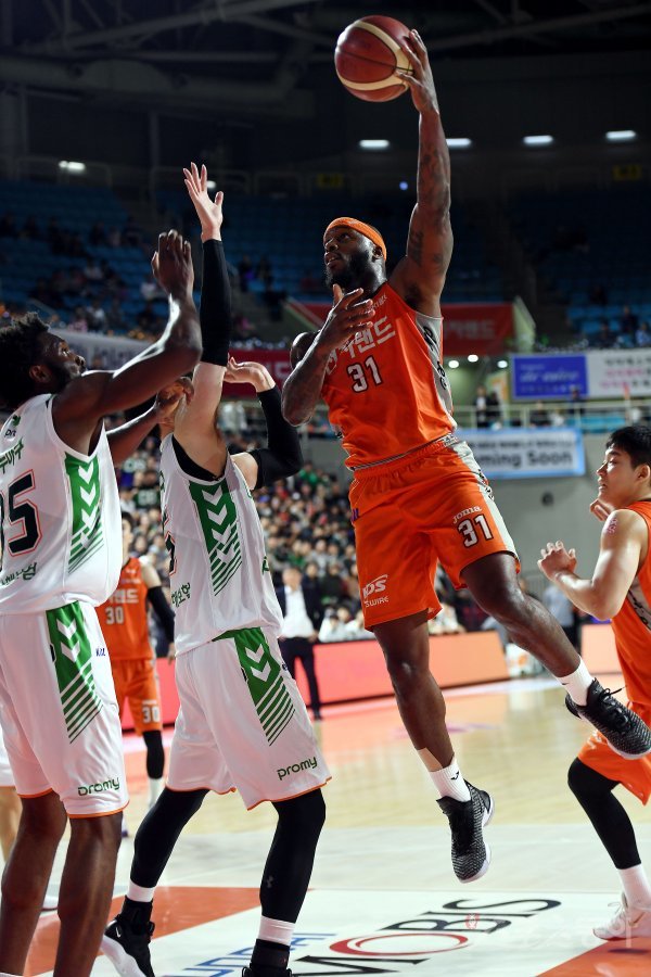 27일 인천 삼산월드체육관에서 열린 ‘2019-2020 현대모비스 프로농구’ 인천 전자랜드와 원주 DB의 경기에서 전자랜드 할로웨이가 DB 수비를 피해 슛을 쏘고 있다.