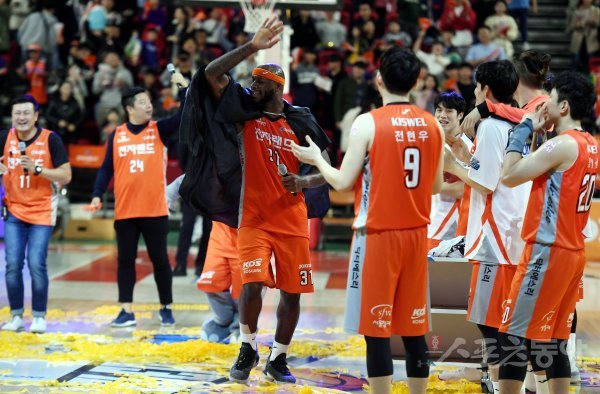27일 인천 삼산월드체육관에서 열린 ‘2019-2020 현대모비스 프로농구’ 인천 전자랜드와 원주 DB의 경기에서 전자랜드를 승리로 이끈 할로웨이가 코트에서 특별 공연을 선보이고 있다.