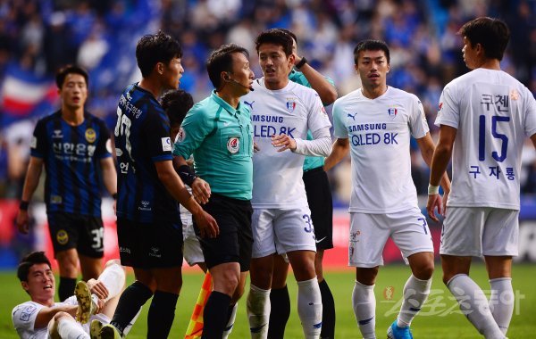 27일 인천축구전용경기장에서 ‘하나원큐 K리그1 2019’ 수원 삼성과 인천 유나이티드의 경기가 열렸다. 후반 양 팀 선수들이 모여 신경전을 벌이고 있다.