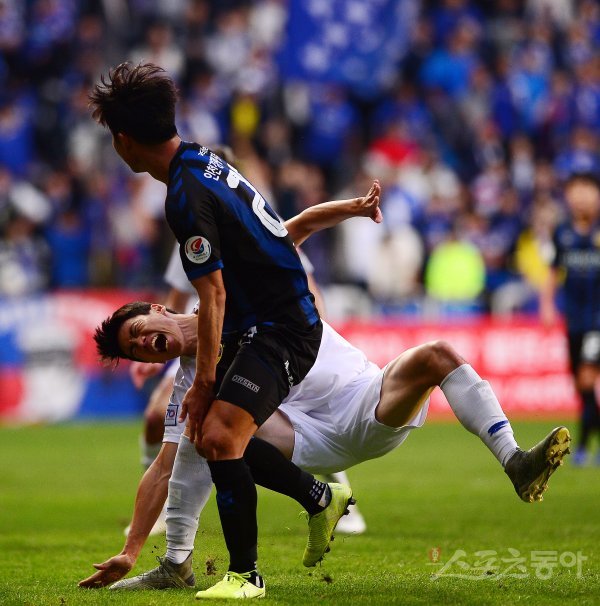 27일 인천축구전용경기장에서 ‘하나원큐 K리그1 2019’ 수원 삼성과 인천 유나이티드의 경기가 열렸다. 수원 이종성이 후반 인천 지연학의 파울에 고통스러워 하고 있다.