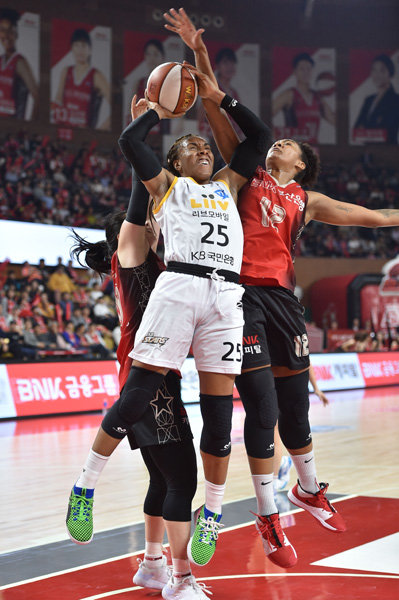 3쿼터는 1쿼터와 비슷했다. 국내 최장신(193㎝) 센터 박지수(10점·11리바운드)를 삼성생명 외국인선수 리네타 카이저(12점·11리바운드)가 마크하자 쏜튼이 삼성생명 국내선수들을 상대로 손쉽게 득점을 쌓았다. 3쿼터 종료 3분 50초를 남기고 KB스타즈는 40-22, 18점차로 더 도망가며 일찌감치 승기를 잡았다. 삼성생명은 지역방어도 꺼내들었지만 크게 효과가 없었다.