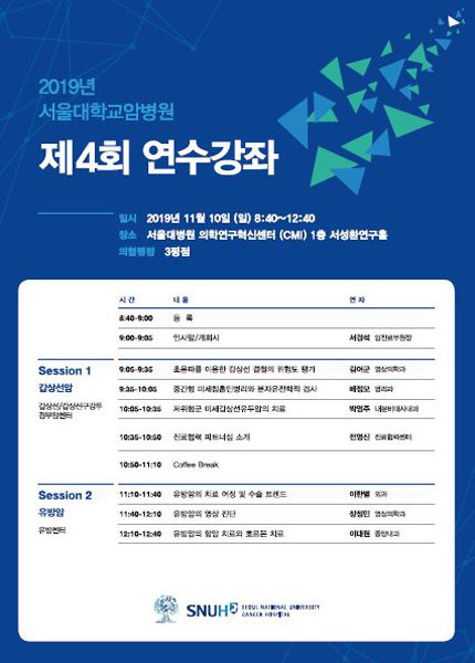 서울대학교 암병원은 11월 10일 오전 8시 40분부터 12시 40분까지 서울대병원 의학연구혁신센터(CMI) 1층 서성환연구홀에서 ‘갑상선암·유방암’을 주제로 연수강좌를 개최한다.