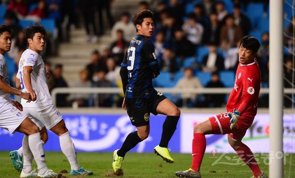 27일 인천축구전용경기장에서 ‘하나원큐 K리그1 2019’ 수원 삼성과 인천 유나이티드의 경기가 열렸다. 인천 명준재가 후반 추가시간에 극적인 동점골을 넣고 있다.