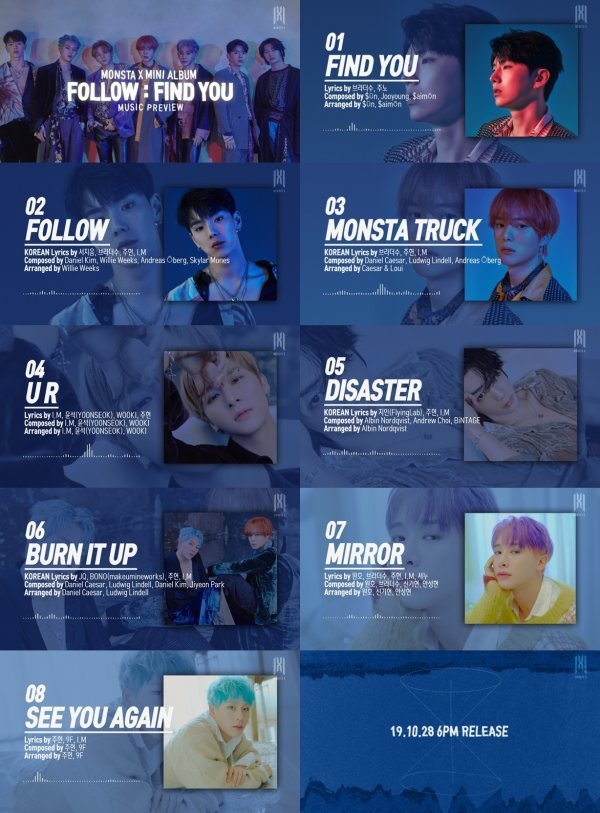 몬스타엑스는 오늘(28일) 오후 6시 각종 음원 사이트를 통해 새 앨범 <\'FOLLOW\' : FIND YOU>를 발표하고, 당일 오후 8시 네이버 V 라이브 몬스타엑스 채널을 통해 특별한 컴백 쇼를 펼친다.