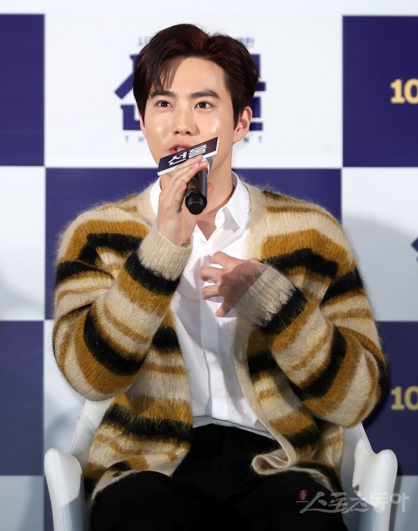 EXO 수호(김준면)가 28일 서울 광진구 롯데시네마 건대입구에서 열린 영화 ‘선물‘ 특별상영회에 참석해 취재진의 질문에 답변하고 있다.