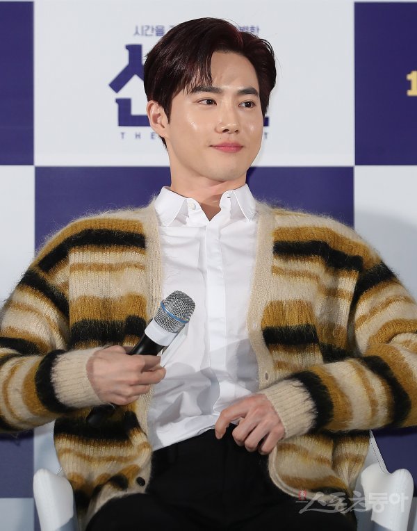 EXO 수호(김준면)가 28일 서울 광진구 롯데시네마 건대입구에서 열린 영화 ‘선물‘ 특별상영회에 참석해 객석을 응시하고 있다.