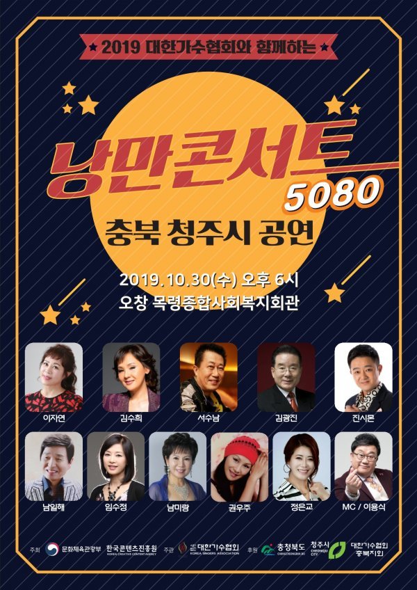 문화체육관광부, 한국콘텐츠진흥원 주최, (사)대한가수협회 주관, 충청북도, 청주시, (사)대한가수협회 충북지회 후원으로 펼쳐지는 2019 낭만콘서트는 지난 4월 28일 경남 산청에서 개막한 이래 청도, 오산, 영광, 창녕, 하남, 합천, 평창, 의왕, 정선을 거쳐 이번 30일 청주에서 대장장의 막을 내린다.