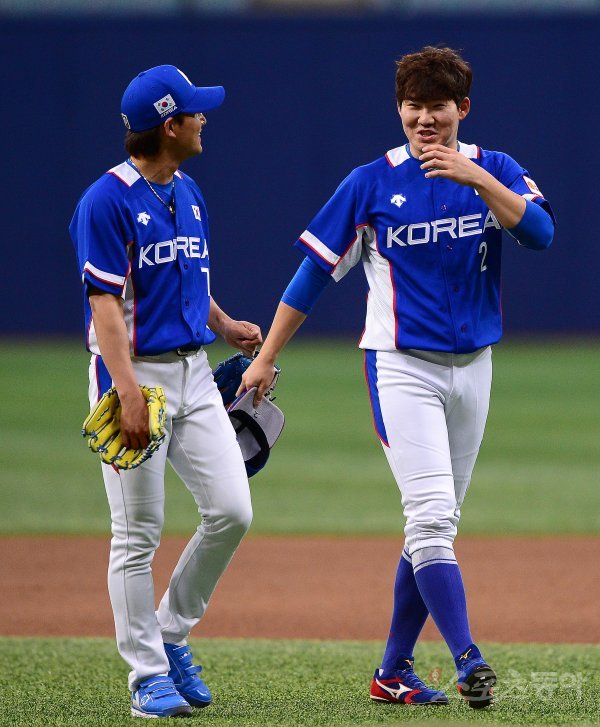 김상수와 박민우(오른족)가 즐겁게 대화를 나누며 이동하고 있다.
