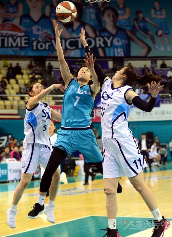 28일 경기도 부천실내체육관에서 열린 ‘하나원큐 2019-2020 여자프로농구’ 부천 KEB하나은행과 인천 신한은행의 경기에서 KEB하나은행 고아라가 신한은행 김단비의 수비를 피해 슛을 쏘고 있다.