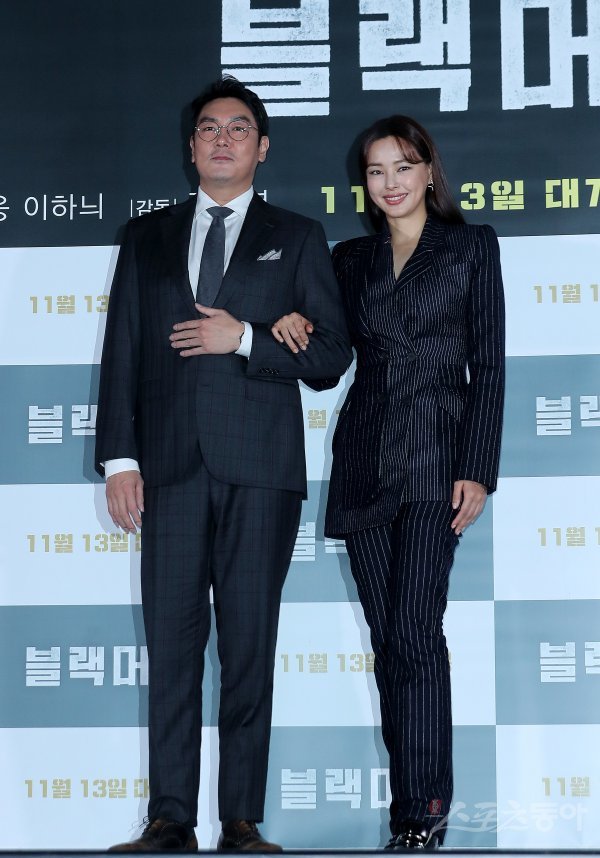 배우 조진웅과 이하늬(오른쪽)가 28일 서울 용산구 CGV 용산아이파크몰에서 열린 영화 ‘블랙머니’ 언론시사회에서 포즈를 취하고 있다.