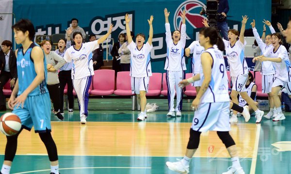 28일 경기도 부천실내체육관에서 열린 ‘하나원큐 2019-2020 여자프로농구’ 부천 KEB하나은행과 인천 신한은행의 경기에서 신한은행이 KEB하나은행에 87-75로 승리한 뒤 선수들이 코트에서 기쁨을 나누고 있다.