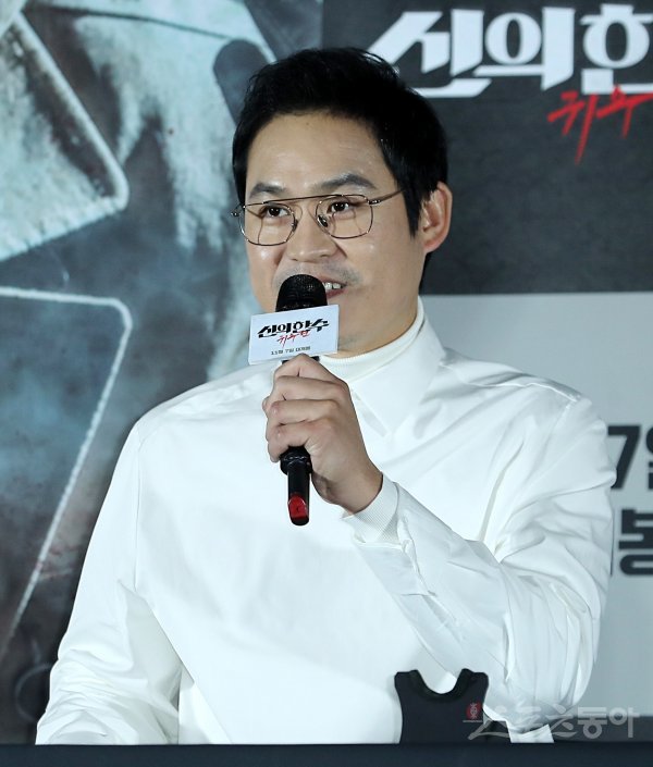 배우 김성균이 29일 서울 용산구 CGV 용산아이파크몰에서 열린 영화 ‘신의 한 수 : 귀수편’ 언론시사회에서 취재진의 질문에 답변하고 있다.