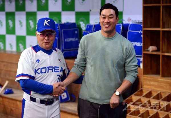 29일 서울 고척스카이돔에서 한국야구대표팀이 훈련을 가졌다. 야구대표팀 김경문 감독과 봉중근이 이야기를 나누고 있다.