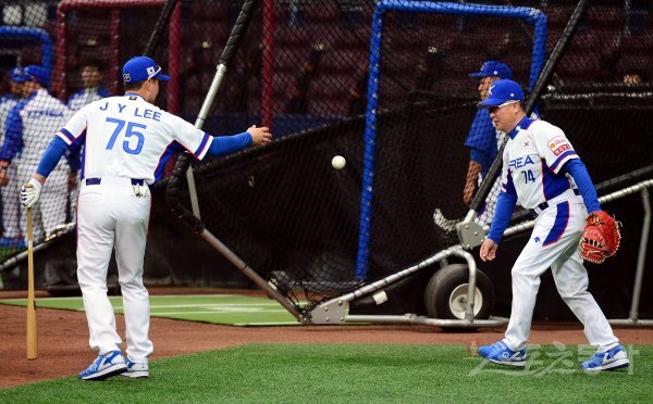 29일 서울 고척스카이돔에서 한국야구대표팀이 훈련을 가졌다. 야구대표팀 김경문 감독이 훈련 보조로 나서고 있다.