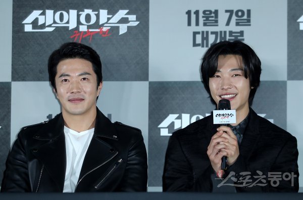 배우 우도환(오른쪽)이 29일 서울 용산구 CGV 용산아이파크몰에서 열린 영화 ‘신의 한 수 : 귀수편’ 언론시사회에서 취재진의 질문에 답변하고 있다.