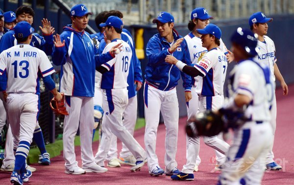 29일 서울 고척스카이돔에서 한국야구대표팀이 상무 야구단과 연습경기를 가졌다. 8회말 무사 만루에서 삼중살로 이닝을 종료 시킨 한국 야구대표팀이 그라운드에서 기쁨을 나누고 있다.