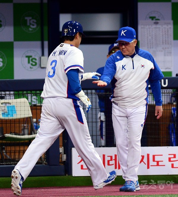 29일 서울 고척스카이돔에서 한국야구대표팀이 상무 야구단과 연습경기를 가졌다. 6회초 무사 만루에서 한국 최정의 적시타 때 득점에 성공한 민병헌이 김경문 감독의 환영을 받고 있다.