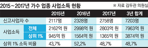 30일 국회 기획재정위원회 소속 김두관 더불어민주당 의원이 국세청으로부터 제출받은 자료에 따르면 2015∼2017년 가수업종 사업소득 상위 1%가 전체 소득의 약 절반을 차지했다. 해당 3년 동안 가수 업종의 총 사업수입은 1조821억원, 총 사업소득은 7963억 원이었다. 이 중 상위 1%에 해당하는 이들의 사업소득은 3874억 원으로, 인기를 누리는 소수 가수가 전체 가수 사업소득의 절반가량을 벌어들였다.