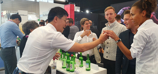 10월 5일부터 9일까지 독일 쾰른에서 열린 식음료 산업박람회 ‘아누가 2019’에서 시음행사를 하고 있는 하이트진로 직원들. 하이트진로가 유럽 시장에서 한국 소주 알리기에 나섰다. 사진제공|하이트진로