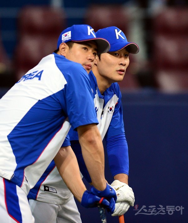 2일 서울 구로구 고척스카이돔에서 한국과 푸에르토리코의 야구대표팀 평가전 경기가 열린다. 경기 전 야구대표팀 김하성과 김재환이 훈련을 지켜보고 있다. 고척 | 김민성 기자 marineboy@donga.com