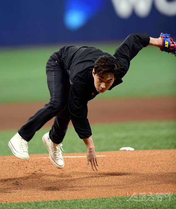 2일 서울 구로구 고척스카이돔에서 한국과 푸에르토리코의 야구대표팀 평가전 경기가 열렸다. 가수 헨리가 시구를 던진 뒤 넘어지고 있다. 고척 | 김민성 기자 marineboy@donga.com