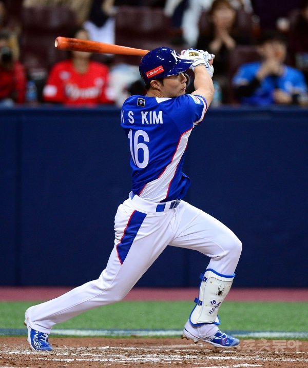 2일 서울 구로구 고척스카이돔에서 한국과 푸에르토리코의 야구대표팀 평가전 경기가 열렸다. 3회초 1사 2, 3루에서 한국 김하성이 2타점 적시타를 날리고 있다. 고척 | 김민성 기자 marineboy@donga.com