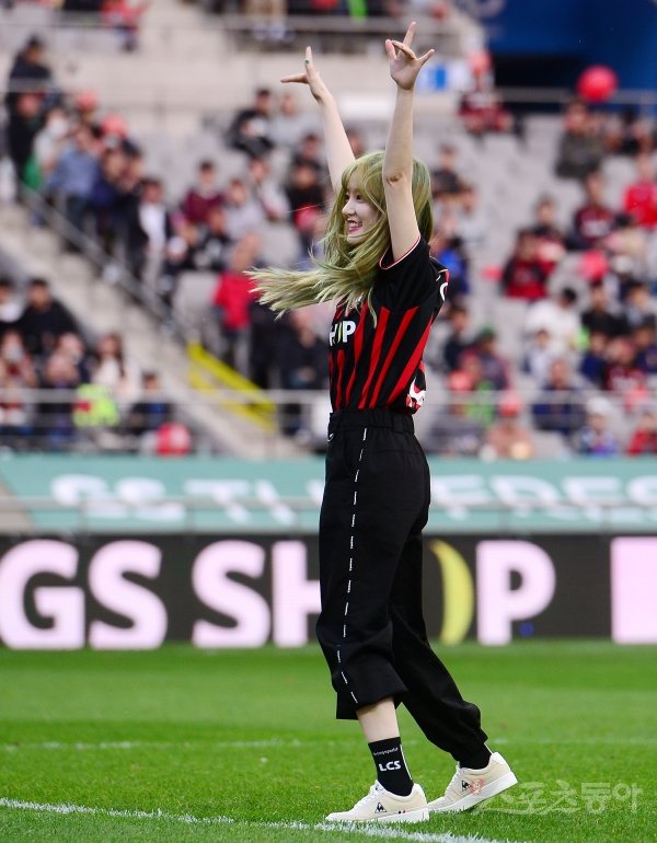 3일 서울월드컵경기장에서 ‘하나원큐 K리그1 2019’ FC 서울과 울산 현대의 경기가 열렸다. 배우 이유비가 경기 전 시축행사를 마친 후 두 손을 들며 환호하고 있다.