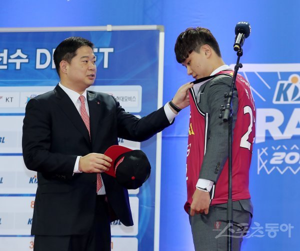 4일 서울 잠실학생체육관에서 ‘2019 KBL 국내신인선수 드래프트’가 열렸다. 창원 LG 현주엽 감독이 고려대 박정현을 선발한 후 유니폼을 입혀주고 있다.
