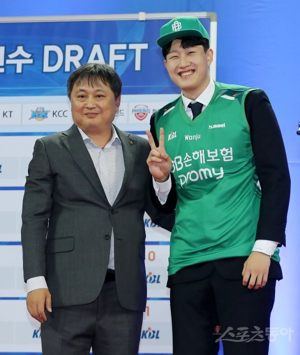4일 서울 잠실학생체육관에서 ‘2019 KBL 국내신인선수 드래프트’가 열렸다. 성균관대 이윤수가 6순위로 원주 DB에 선발된 후 이상범 감독과 기념촬영을 하고 있다.