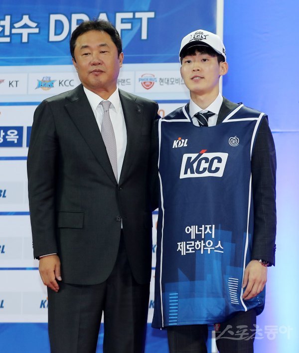 4일 서울 잠실학생체육관에서 ‘2019 KBL 국내신인선수 드래프트’가 열렸다. 중앙대 김세창이 8순위로 전주 KCC에 선발된 후 전창진 감독과 기념촬영을 하고 있다.