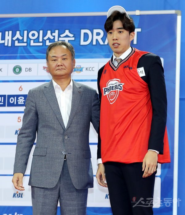 4일 서울 잠실학생체육관에서 ‘2019 KBL 국내신인선수 드래프트’가 열렸다. 중앙대 이진석이 2라운드 1순위로 울산 모비스에 선발된 후 유재학 감독과 기념촬영을 하고 있다.