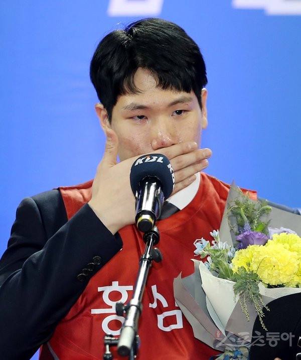 4일 서울 잠실학생체육관에서 ‘2019 KBL 국내신인선수 드래프트’가 열렸다. 중앙대 박건호가 4라운드 9순위로 안양 KGC에 선발된 후 눈물을 흘리며 소감을 밝히고 있다.