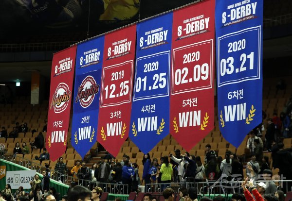 경기 후 S-더비에서 승리한 서울 SK의 걸개가 서울 삼성 홈구장인 잠실실내체육관에 걸리고 있다.