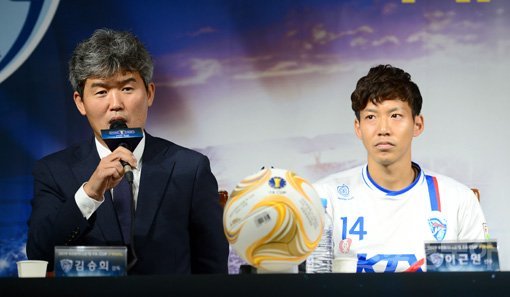 사상 첫 FA컵 우승을 노리는 실업축구 대전 코레일이 6일 오후 7시 대전한밭운동장에서 수원 삼성과 결승 1차전을 치른다. 일전을 앞둔 4일 서울 신문로 축구회관에서 진행된 미디어데이에서 각오를 다지고 있는 대전 코레일 김승회 감독(왼쪽)과 주장 이근원.김종원 기자 won@donga.com