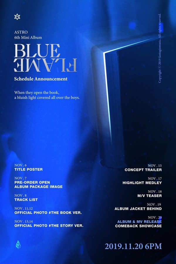 아스트로(MJ, 진진, 차은우, 문빈, 라키, 윤산하)의 소속사 판타지오뮤직은 5일 오후 6시 공식 SNS 채널을 통해 11월 20일 발매 예정인 미니 6집 앨범 \'BLUE FLAME\'(블루 플레임)의 프로모션 플랜 포스터를 공개했다.