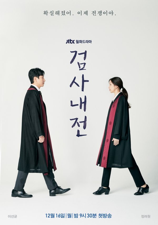 JTBC 새 월화드라마 ‘검사내전’(연출 이태곤, 크리에이터 박연선, 극본 이현, 서자연, 제작 에스피스, 총16부작)은 미디어 속 화려한 법조인이 아닌 지방 도시 진영에서 하루하루 살아가는 평범한 ‘직장인 검사’들의 이야기. 믿고 보는 배우 이선균, 정려원이 주연을 맡아 기대감을 높이는 가운데, 오늘(6일) 최초 공개된 티저 포스터와 영상이 극과 극 검사 이선웅(이선균)과 차명주(정려원)의 전쟁을 예고해 호기심을 유발한다.