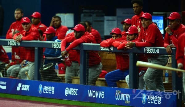 6일 서울 구로구 고척스카이돔에서 ‘2019 세계야구소프트볼연맹(WBSC) 프리미어12’ 서울예선라운드 쿠바와 캐나다의 경기가 열렸다. 캐나다에 0-3으로 뒤진 쿠바 선수들이 9회말 경기를 지켜보고 있다.