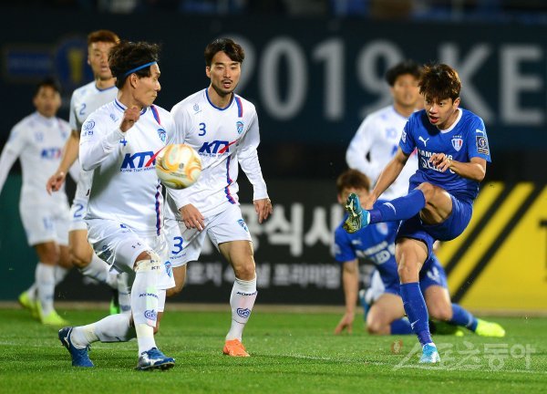 6일 대전한밭종합운동장에서 열린 ‘2019 KEB하나은행 FA컵’ 결승 1차전 수원삼성과 대전코레일 경기에서 수원삼성 전세진이 슛팅을 날리고 있다. 대전 | 김종원 기자 won@donga.com