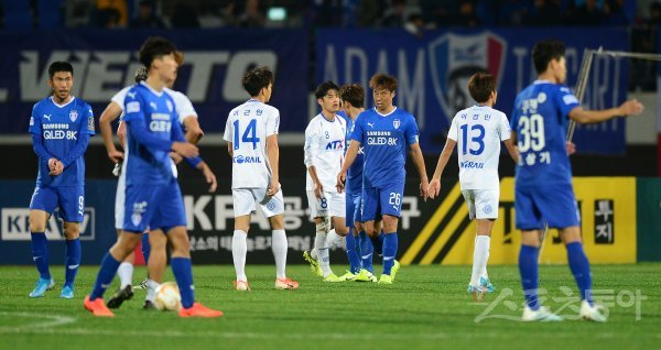 6일 대전한밭종합운동장에서 열린 ‘2019 KEB하나은행 FA컵’ 결승 1차전 수원삼성과 대전코레일 경기에서 0-0 무승부를 기록한 양팀 선수들이 아쉬워하고 있다. 대전 | 김종원 기자 won@donga.com