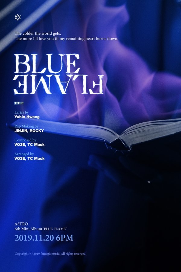지난 6일 아스트로(MJ, 진진, 차은우, 문빈, 라키, 윤산하) 소속사 판타지오뮤직은 공식 SNS 채널에 미니 6집 앨범 \'BLUE FLAME\'의 타이틀곡명이 담긴 \'타이틀 포스터\'를 게재했다.