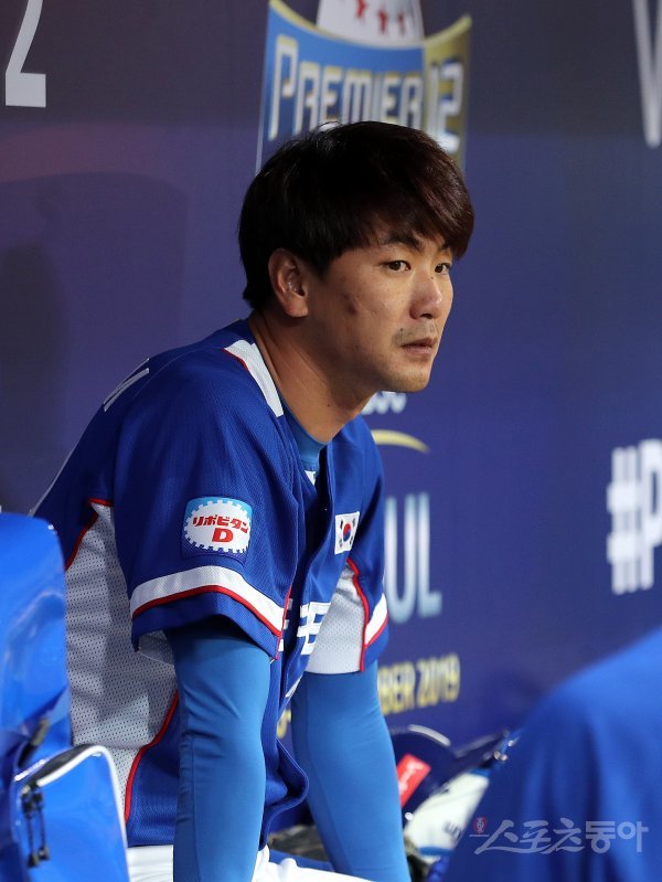 대한민국 김광현이 경기 전 덕아웃에서 그라운드를 응시하고 있다.