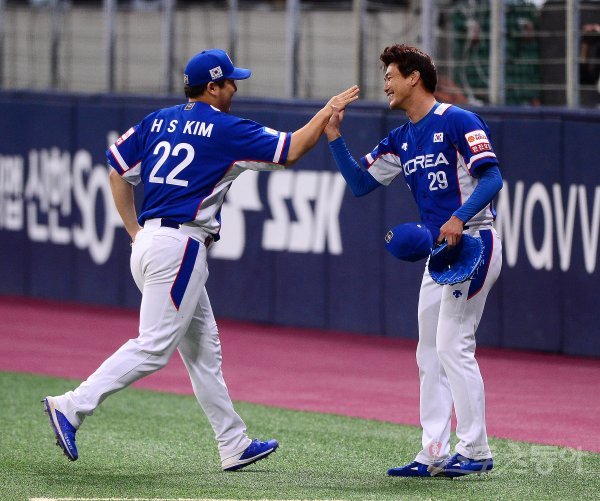 7일 서울 구로구 고척스카이돔에서 ‘2019 세계야구소프트볼연맹(WBSC) 프리미어12’ 서울예선라운드 대한민국과 캐나다의 경기가 열렸다. 대한민국 선발 김광현이 1회말 호수비를 보여준 김현수(왼쪽)와 하이파이브를 하고 있다. 고척 | 김진환 기자 kwangshin00@donga.com