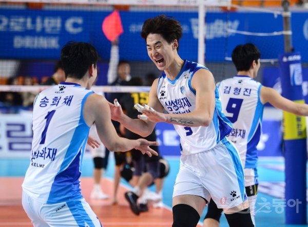 7일 대전충무체육관에서 열린 ‘도드람 2019~2020 V-리그’ 남자부 KB손해보험 삼성화재의 경기에서 삼성화재 박철우가 공격 득점에 성공한 후 기뻐하고 있다. 대전 | 김종원 기자 won@donga.com
