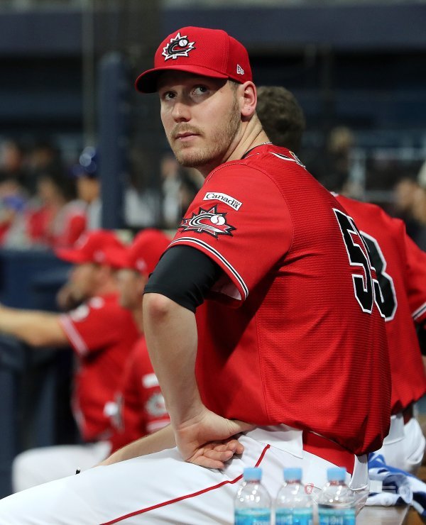 7일 서울 구로구 고척스카이돔에서 ‘2019 세계야구소프트볼연맹(WBSC) 프리미어12’ 서울예선라운드 대한민국과 캐나다의 경기가 열렸다. 캐나다 다익손이 7회초 대한민국의 공격을 덕아웃에서 지켜보고 있다. 고척 | 김진환 기자 kwangshin00@donga.com