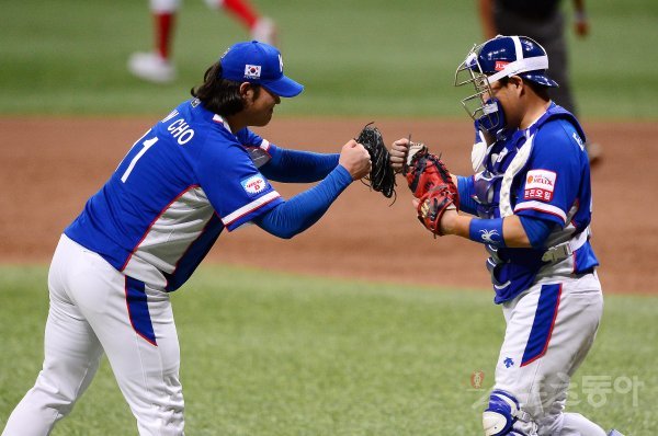 7일 서울 구로구 고척스카이돔에서 열린 ‘2019 세계야구소프트볼연맹(WBSC) 프리미어12’ 서울예선라운드 대한민국과 캐나다의 경기에서 대한민국이 3-1 승리를 거두며 2연승으로 조 1위로 올라섰다. 경기 후 대한민국 마무리 조상우와 포수 양의지(오른쪽)가 하이파이브를 하고 있다. 고척 | 김진환 기자 kwangshin00@donga.com