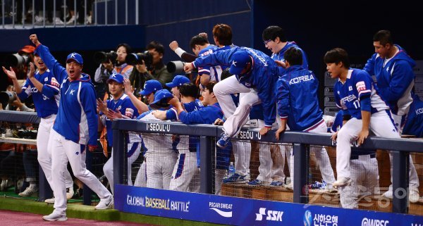 7일 서울 구로구 고척스카이돔에서 열린 ‘2019 세계야구소프트볼연맹(WBSC) 프리미어12’ 서울예선라운드 대한민국과 캐나다의 경기에서 대한민국이 3-1 승리를 거두며 2연승으로 조 1위로 올라섰다. 경기 후 대한민국 선수들이 환호하며 그라운드로 나오고 있다. 고척 | 김진환 기자 kwangshin00@donga.com