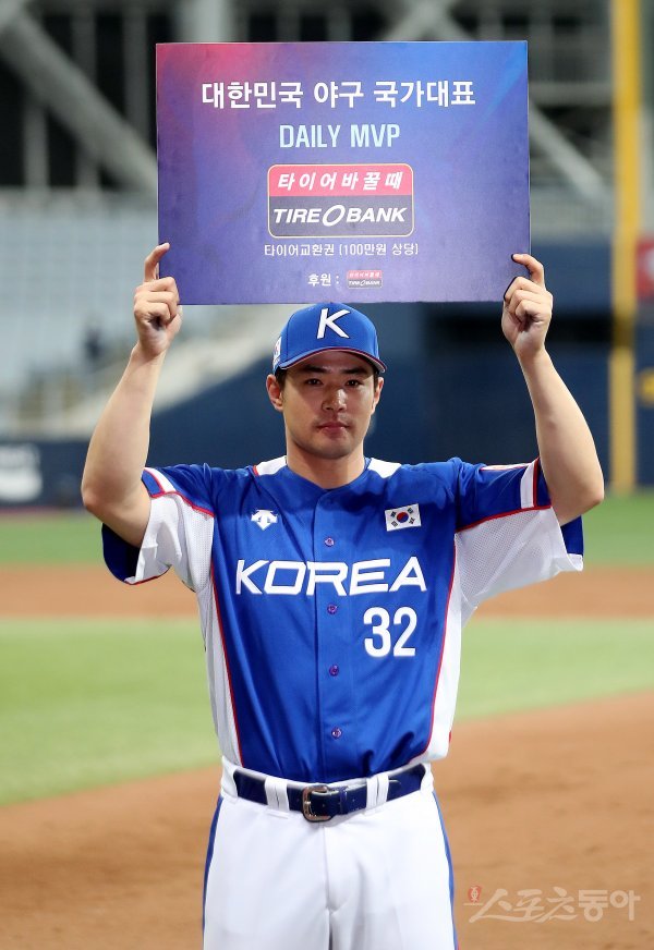 경기 후 대한민국 김재환이 데일리 MVP에 선정된 후 기념촬영을 하고 있다.