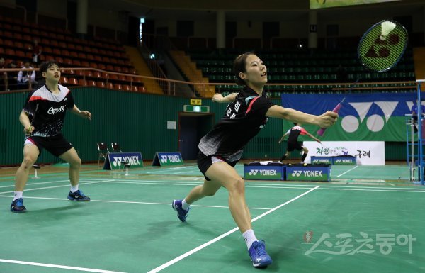 일반혼합복식 준결승 한요셉-이승희 조와 김영혁-이정현 조의 경기에서 이승희가 상대 공격을 리시브 하고 있다.