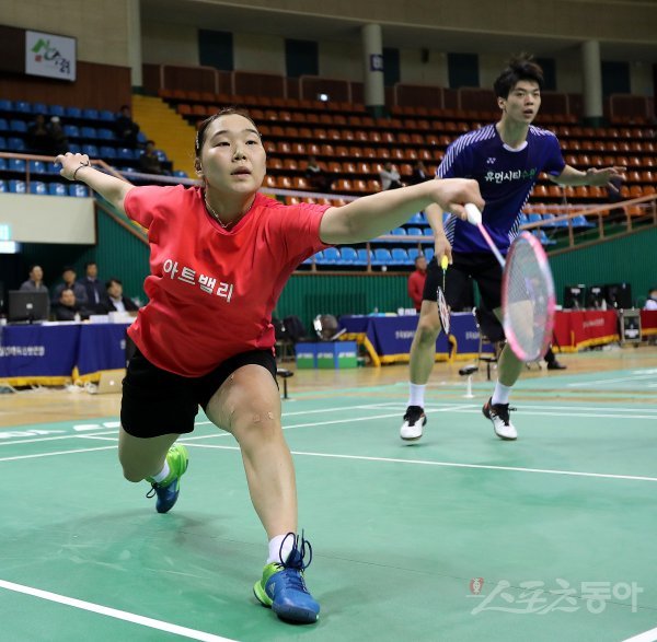 일반혼합복식 결승전 김영혁-이정현 조의 이정현이 상대 공격을 리시브 있다.