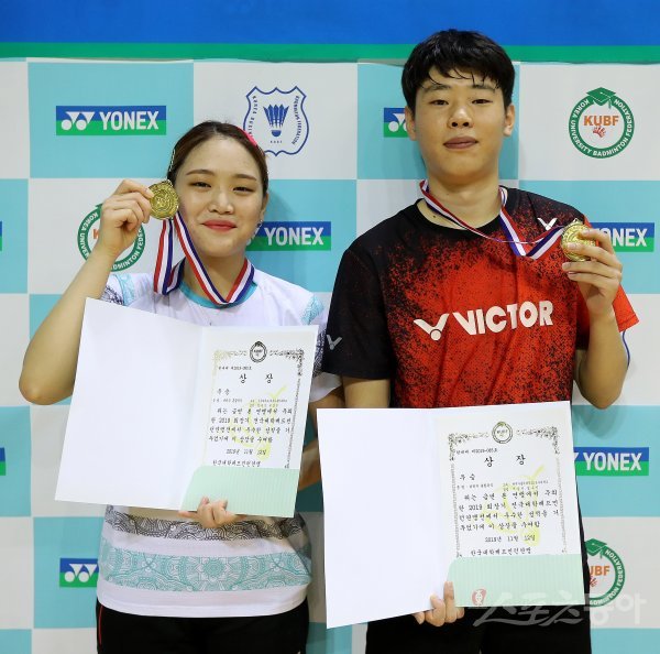 대학혼합복식 공주대학교 길수민과 대구가톨릭대학교 서강민(오른쪽)이 우승을 차지한 후 기념촬영을 하고 있다.
